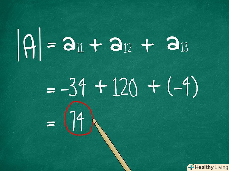 Складіть отримані результати. Це останній крок. Вам необхідно скласти отримані алгебраїчні доповнення елементів опорного рядка (або опорного стовпця). Складіть їх разом, і ви отримаєте значення визначника матриці 3x3.- У нашому прикладі визначник дорівнює-34 + 120 + -12 = 74.