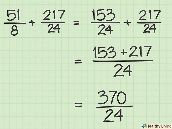 Складіть чисельники, а знаменник залиште без змін.складіть чисельники, коли приведете дроби до спільного знаменника (або якщо знаменники дробів були однаковими з самого початку). Результат додавання чисельників запишіть над знаменником. Знаменники не складайте![10]- У нашому прикладі: 153/24 + 217/24 = 370/24.