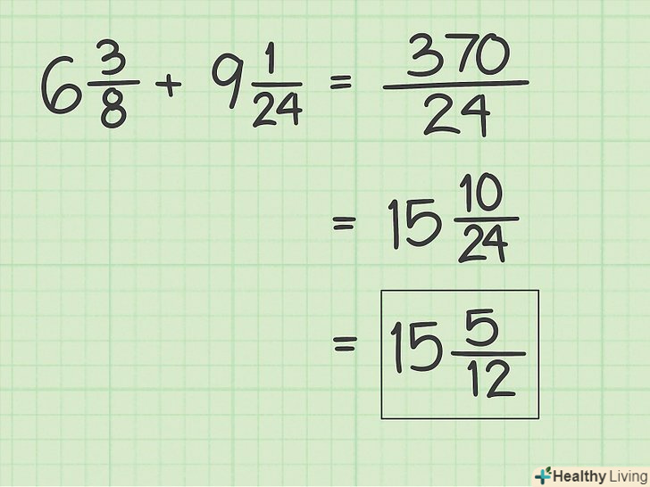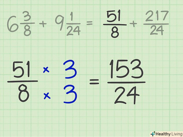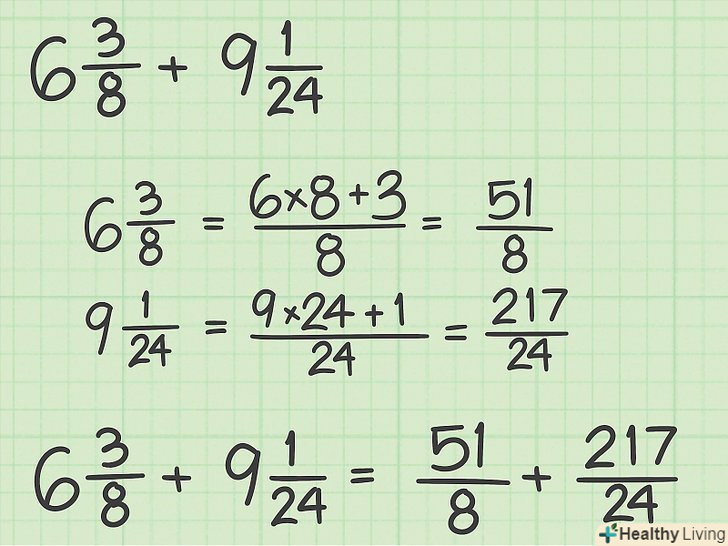 Перетворіть змішані числа в неправильні дроби. якщо дані змішані числа (вони включають ціле число і дріб), перетворіть їх в неправильні дроби, щоб спростити додавання. Пам'ятайте, що чисельники неправильних дробів більше знаменників.[6]- Наприклад, складіть 6 3/8 + 9 1/24. Ці змішані числа перетворяться в дроби 51/8 + 217/24.