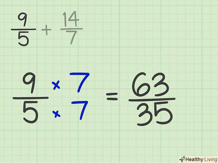 Помножте чисельник і знаменник першого дробу на відповідне число, щоб привести дробу до спільного знаменника.Пам'ятайте, що на це число потрібно помножити не тільки знаменник, а й чисельник.[2]- У нашому прикладі помножте 9/5 на 7, щоб отримати знаменник 35. Чисельник також помножте на 7; таким чином, ви отримаєте дріб 63/35.
