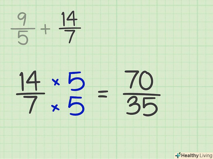 Помножте чисельник і знаменник другого дробу на відповідне число, щоб привести дробу до спільного знаменника.Пам'ятайте, що на це число потрібно помножити не тільки знаменник, а й чисельник.[3]- У нашому прикладі помножте 14/7 на 5, щоб отримати дріб 70/35. Таким чином, вихідна задача 9/5 + 14/7 перепишеться так: 63/35 + 70/35.