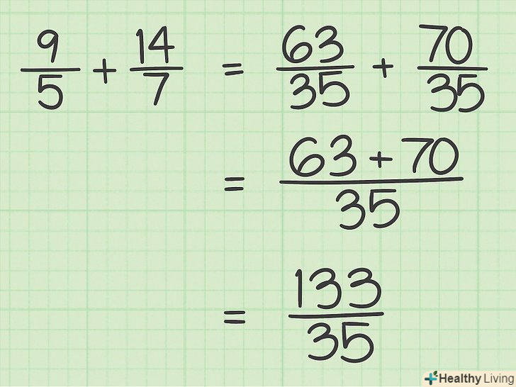 Складіть чисельники, а знаменники залиште без змін. коли ви приведете обидві дроби до спільного знаменника, складіть чисельники. Результат запишіть над знаменником.[4]- У нашому прикладі: 63 + 70 = 133. Запишіть цей результат над знаменником, щоб отримати дріб 133/35.