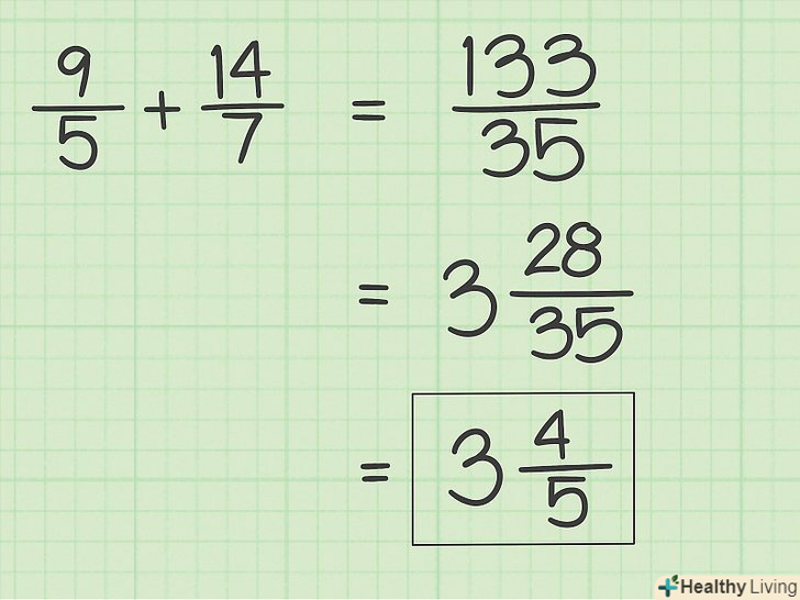 Спростіть або скоротіть отриманий дріб (якщо потрібно). якщо вийшла неправильна дріб, Перетворіть її в змішане число. Для цього чисельник розділіть на знаменник, щоб отримати ціле число. Залишок ділення запишіть над знаменником. Тепер дріб можнаскоротити (Якщо вона скорочується).[5]- Наприклад, дріб 133/35 можна перетворити в змішане число 3 28/35. Тепер дріб 28/35 скоротіть до 4/5. Таким чином, остаточна відповідь дорівнює 3 4/5.