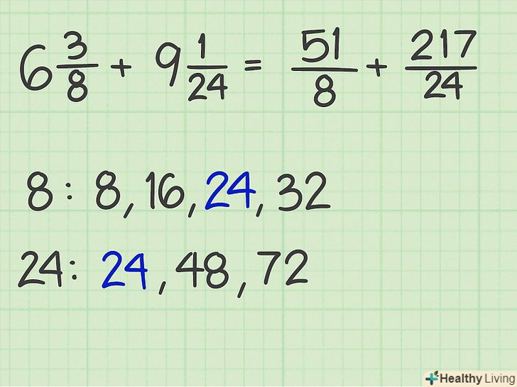 Знайдіть Найменше спільне кратне (НОК) знаменників. якщо знаменники різні, запишіть кратні кожного з них, а потім знайдіть найменше спільне кратне. У нашому прикладі 51/8 + 217/24 випишіть кратні знаменників 8 і 24; ви знайдете, що НОК дорівнює 24.[7]- Кратними 8 є 8, 16, 24, 32, 48, а кратними 24-24, 48, 72. Отже, НОК дорівнює 24.