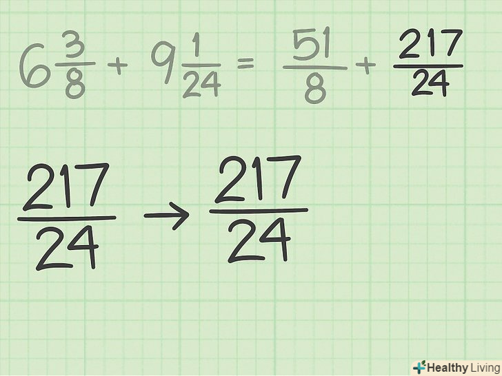 Помножте інші дроби (чисельник і знаменник) на відповідне число, щоб привести їх до спільного знаменника. якщо в задачі У інших дробів різні знаменники, також помножте їх на деяке число, щоб привести до спільного знаменника. Якщо знаменник дробу вже дорівнює НОК, такий дріб залиште без змін.[9]- У нашому прикладі другий дріб 217/24, тобто її знаменник вже дорівнює НОК. Таким чином, цей дріб міняти не потрібно.