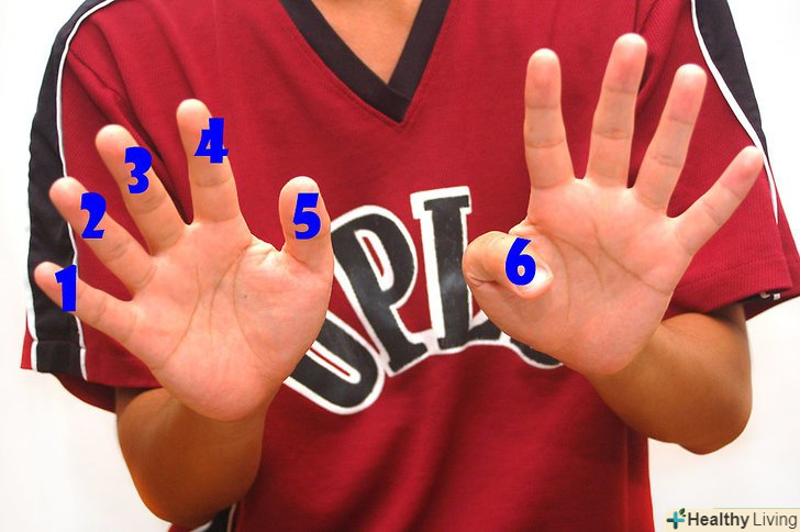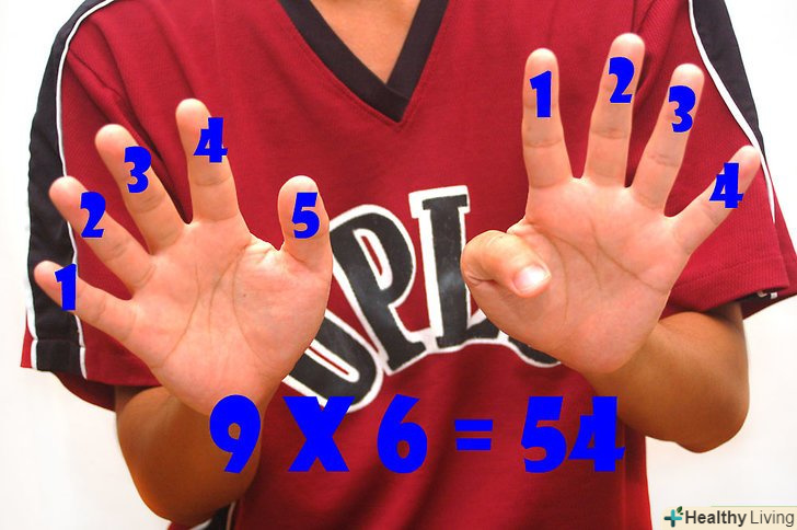 Якщо ви множите 9 X 6, зігніть ваш шостий палець (вважайте завжди зліва направо).якщо це 9 X 4, загніть четвертий палець і так далі.- Скільки пальців залишилося розігнутими зліва від зігнутого пальця? У цьому випадку (9 X 6), залишиться п'ять пальців (всі пальці на вашій лівій руці). Це ваші десятки