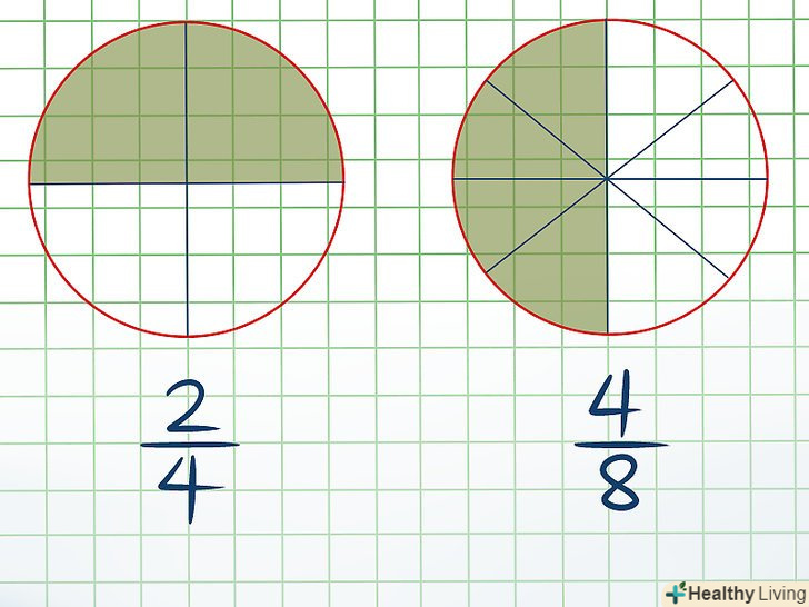 Зрозумійте, що таке еквівалентні дроби. якщо помножити чисельник і знаменник певної дробу на деяке число, то ви отримаєте еквівалентну дріб, рівну вихідної дробу. Наприклад, якщо ви помножите дріб 2/4 на 2, Ви отримаєте дріб 4/8, яка дорівнює (еквівалентна) вихідної дробу 2/4. Ви можете перевірити це наступним чином:- Намалюйте коло, розділіть його на чотири рівні частини і зафарбуйте дві з них (2/4).