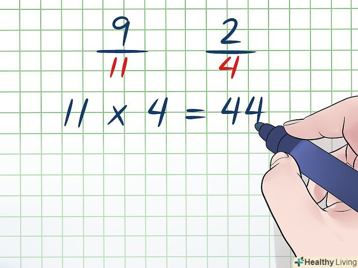 Запишіть дроби поруч один з одним.напишіть їх так, щоб чисельники дробів (верхні числа) і знаменники дробів (Нижні числа) розташовувалися навпроти один одного. Наприклад, розглянемо дроби 9/11 і 2/4.