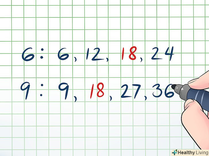 Знайдіть найменший спільний знаменник (НОЗ). це найменше число, яке ділиться на знаменники даних дробів. Для обчислення НОЗ запишіть кратні кожного знаменника даних дробів. Підкресліть найменше число, яке зустрічається в обох списках. На цей раз розглянемо такий приклад: 5/6 + 2/9.- У нашому прикладі знаменники рівні 6 і 9, тому для першого знаменника пишіть числа, що діляться на 6, а для другого – на 9.