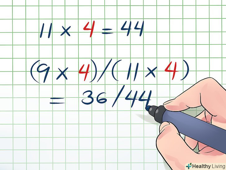 Перетворіть перший дріб в еквівалентну, знаменник якої дорівнює спільному знаменнику.у нашому першому прикладі (дроби 9/11 і 2/4) загальний знаменник дорівнює 44. Але пам'ятайте, що ви не можете змінити знаменник дробу без зміни його чисельника.- Розділіть знайдений спільний знаменник на знаменник першого дробу: 44 ÷ 11 =4