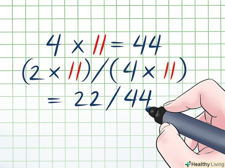 Виконайте те ж саме з другим дробом.ось як перетворити дріб 2/4 в еквівалентну дріб зі знаменником 44:- 44 ÷ 4 =11