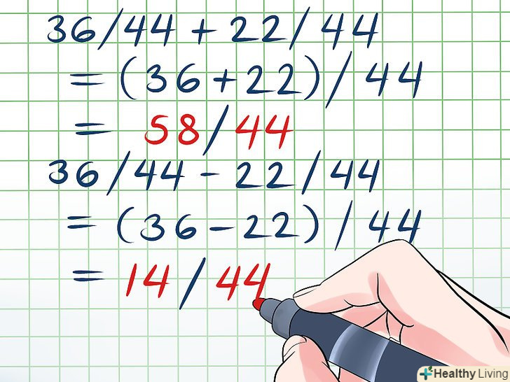 Привівши дроби до спільного знаменника, складіть або відніміть чисельники дробів, щоб отримати відповідь.- Додавання: 36 / 44 + 22 / 44 = (36 + 22) / 44 =58/44