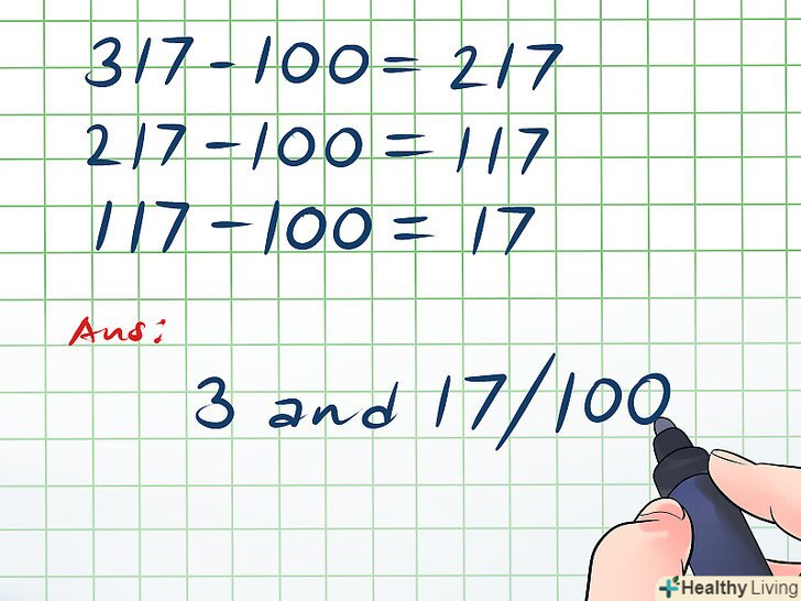 - 317 - 100 = 217 (відняли 1 раз). 217 - 100 = 117 (відняли 2 рази). 117 - 100 = 17 (відняли 3 рази). Більше віднімати не можна, тому Відповідь: 3 17/100.