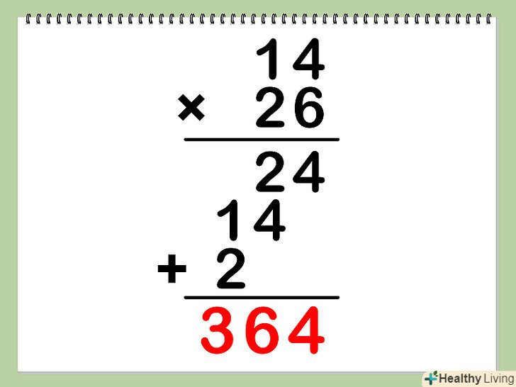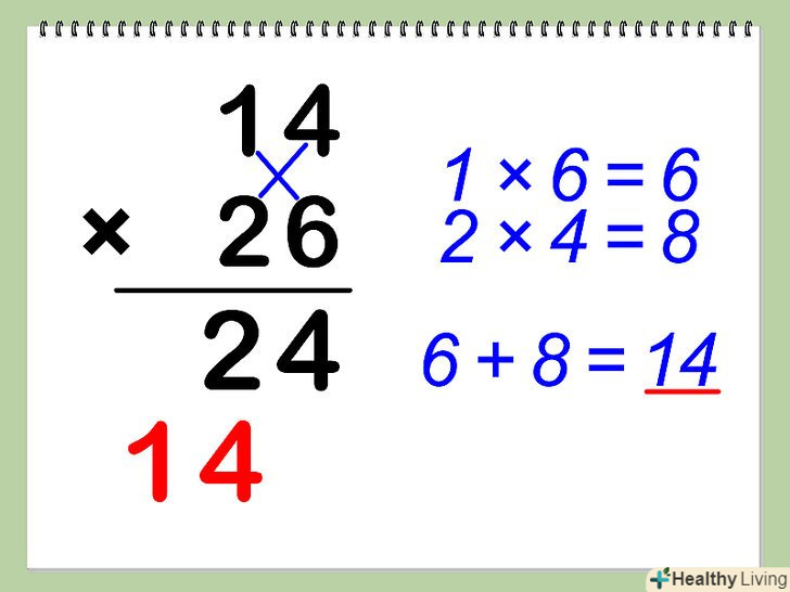 Помножте навхрест. так само як і вище, помножте одиничні розряди з протилежними десятковими розрядами. У цьому випадку (2*4) + (6*1) = 14. Запишіть 14 під 24, зсунувши на одну цифру вліво (щоб число закінчувалося на рівні десяткового розряду множаться чисел)