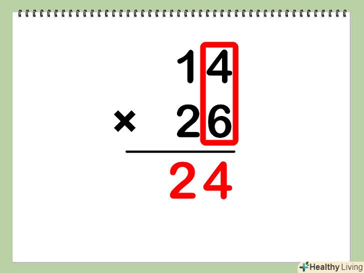 Помножте числа одиничних розрядів і запишіть результат під числами, як показано на малюнку. у цьому випадку 6*4 більше 10 (24).