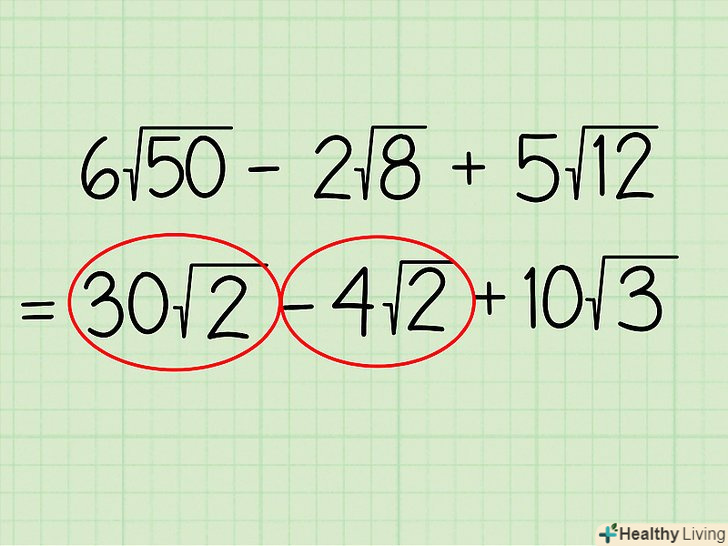 Підкресліть коріння, підкорені вирази яких однакові.у нашому прикладі спрощений вираз має вигляд: 30√2 - 4√2 + 10√3. У ньому ви повинні підкреслити перший і другий члени ( 30√2і 4√2), так як у них однакове підкорене число 2. Тільки такі корені ви можете складати і віднімати.