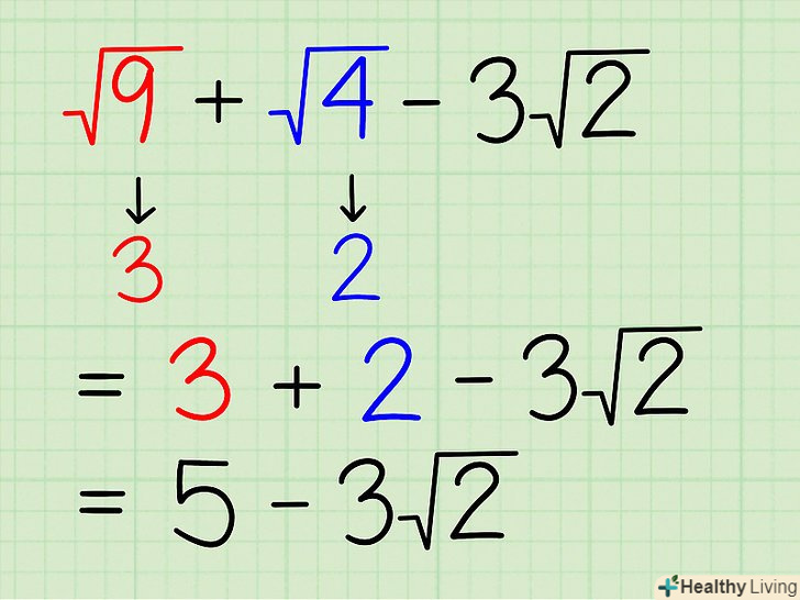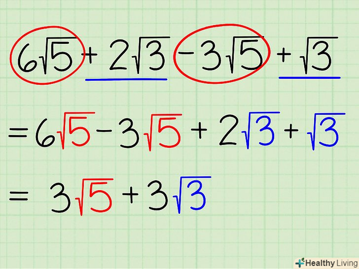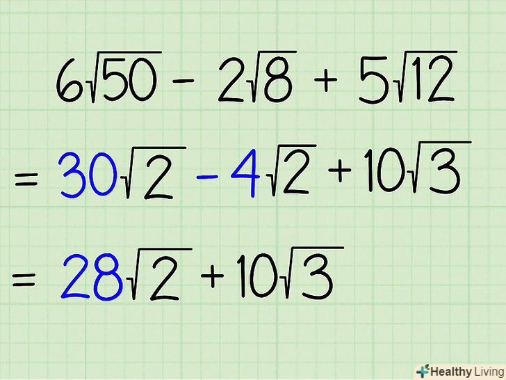 Складати і віднімати квадратні корені можна тільки за умови, що у них однакове підкорене вираз, тобто ви можете скласти або відняти 2√3 і 4√3, але не 2√3 і 2√5. Ви можете спростити підкорене вираз, щоб привести їх до коріння з однаковими підкореними виразами (а потім скласти або відняти їх).