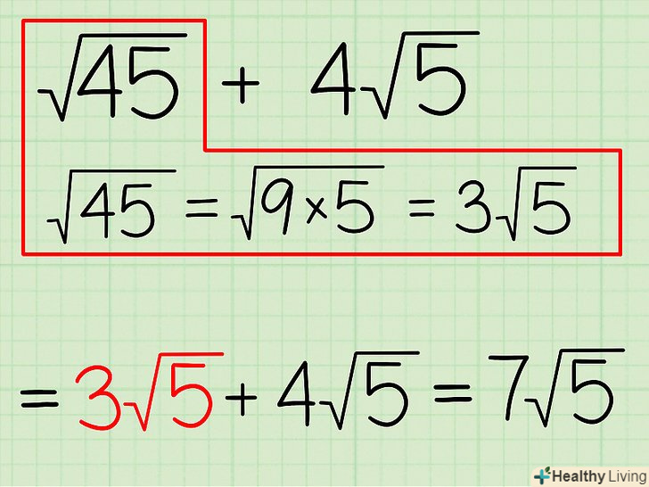 Приклад 1: √(45) + 4√5.- Спростіть √(45). Розкладіть 45 на множники: √(45) = √(9 x 5).