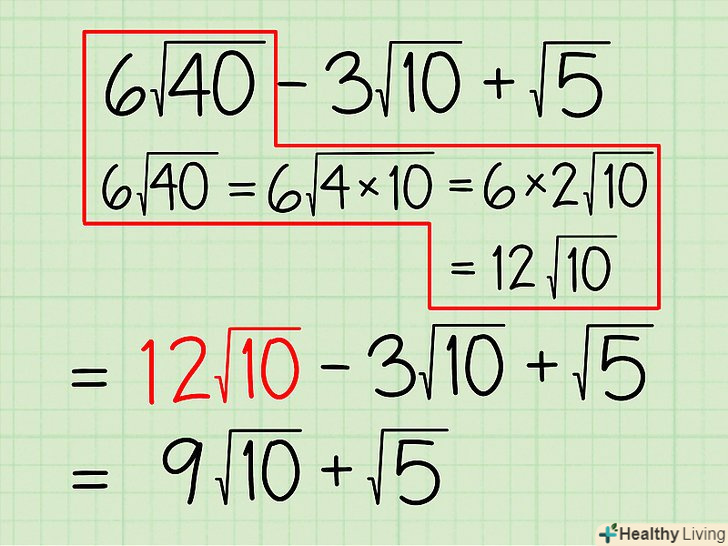 Приклад 2: 6√(40) - 3√(10) + √5.- 6√(40). Розкладіть 40 на множники: 6√(40) = 6√(4 x 10).