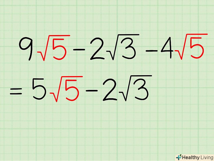 Приклад 3. 9√5 -2√3 - 4√5. Тут жодне з підкорених виразів не можна розкласти на множники, тому спростити цей вираз не вийде. Ви можете відняти третій член з першого (так як у них однакові підкорені числа), а другий член залишити без змін. Ви отримаєте: (9-4)√5 -2√3 = 5√5 - 2√3.