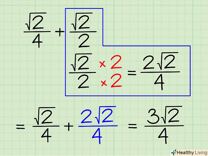 Приклад 5.Вирішіть вираз, що містить коріння і дроби. Ви можете складати і обчислювати тільки ті дроби, у яких загальний (однаковий) знаменник. Дано вираз (√2)/4 + (√2)/2.- Знайдіть найменший спільний знаменник цих дробів. Це число, яке ділиться на кожен знаменник. У нашому прикладі на 4 і на 2 ділиться число 4.