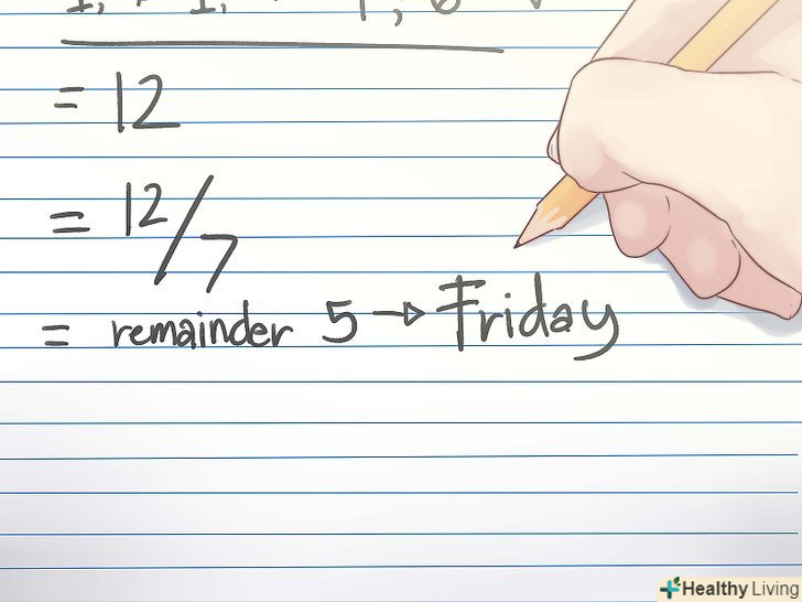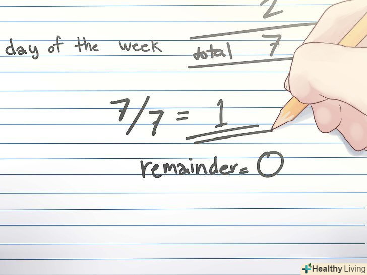 Поділіть отриману суму на 7. якщо виходить залишок: 0 – Неділя; 1-понеділок; 2 – вівторок; 3 – Середа; 4 – четвер; 5 – п'ятниця; 6-субота. Наприклад:- 1.1.2007 ---- 1 + 1 + 0 + 6 + 0 = 8, залишок після поділу на 7 дорівнює 1, так що це понеділок.