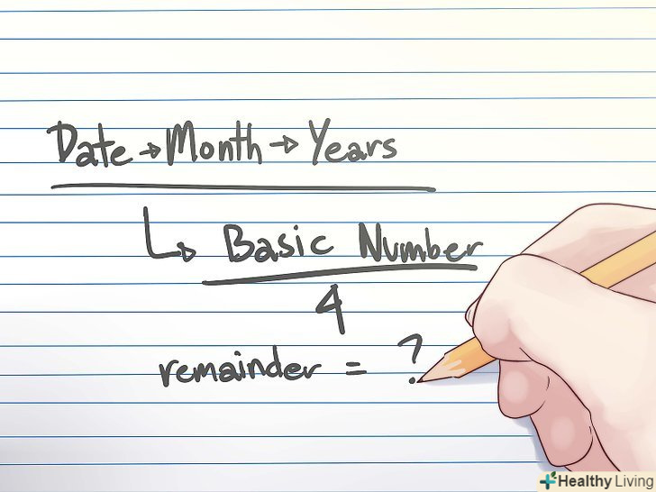 Знайдіть суму "базових номерів" чисел, що представляють День, місяць, рік, залишок після ділення століття на 4, і високосний рік.наприклад, візьмемо 22 жовтня 2010 року. Для дати 22 базовий номер становить 1, для Жовтня-теж 1, а для року 10 вона дорівнює 4. Для століття це 21 поділити на 4, що дає залишок 1, а для 1 базовий номер дорівнює 6. Таким чином, сума базових номерів становить 12.- Базовий номер 0: -- Число -- 07, 14, 21, 28; -- місяць-квітень, липень; - роки --01, 07, 18, 24, 29, 35, 46, 52, 57, 63, 74, 80, 85, 91; -- залишок-0.