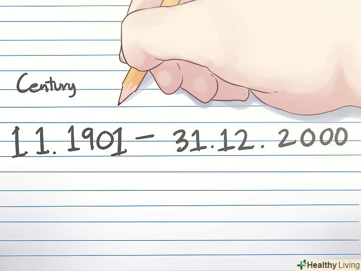 Пам'ятайте - - - - століття починається з 1. 1. 1901 і триває до 31. 12. 2000, і т. п.------- Можливо, вам знадобиться додати базові номери до числа, місяця, року, сторіччя.