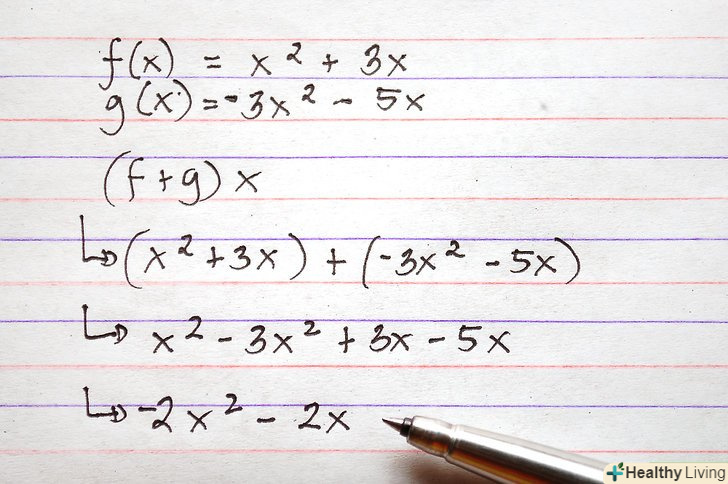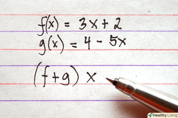 Ви також можете оцінити функції перед тим, як складати або віднімати їх.це необхідно у випадку, якщо вам потрібно знайти значення функції при певному значенні «х».- Наприклад, необхідно знайти (f + g) (2). Є 2 способи зробити це. По-перше, можна скористатися методом, описаним вище, а потім в отриману функцію підставити значення «х».