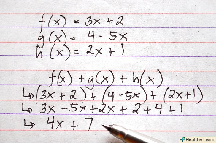 У разі додавання функцій просто складіть їх члени, розташовані праворуч від знака рівності, а потім приведіть подібні члени. (У разі віднімання відніміть члени.) Це виконується без оцінки функцій.- На малюнку показаний приклад додавання двох функцій.
