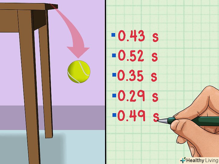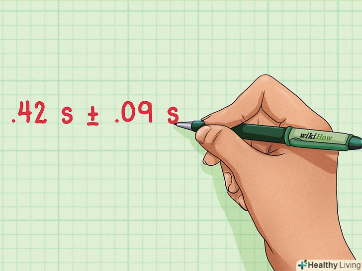 Проведіть кілька вимірювань.Припустимо, ви хочете знайти, скільки часу падає м'яч з висоти столу. Щоб отримати найкращі результати, виміряйте час падіння наскільки разів, наприклад, п'ять. Потім потрібно знайти середнє значення з п'яти отриманих значень вимірювань часу, а потім для найкращого результату додати або відняти середньоквадратичне відхилення.[3]- Припустимо, в результаті п'яти вимірювань отримані результати: 0,43 с, 0,52 с, 0,35 с, 0,29 С і 0,49 с .