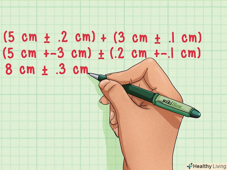 Додавання . щоб скласти величини з похибками, складіть окремо величини і окремо похибки.[6]- (5 см ± 0,2 см) + (3 см ± 0,1 см) =