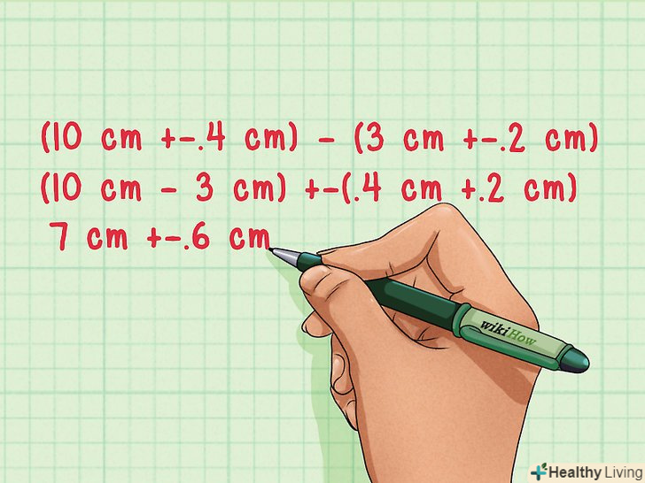 Віднімання. щоб відняти величини з похибками, відніміть величини і складіть похибки.[7]- (10 см ± 0,4 см) - (3 см ± 0,2 см) =