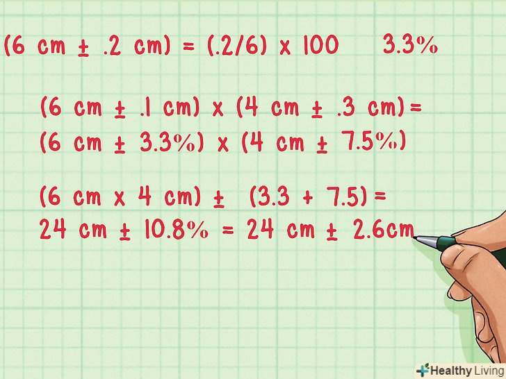 Множення. щоб помножити величини з похибками, перемножте величини і складіть відносні похибки (у відсотках).[8] розрахувати можна тільки відносну похибку, а не абсолютну, як і у випадку зі складанням і відніманням. Щоб дізнатися відносну похибку, розділіть абсолютну похибку на виміряне значення, потім помножте на 100, щоб висловити результат у відсотках. Наприклад:- (6 см ± 0,2 см) = (0,2 / 6) x 100 — додавши знак відсотка, отримуємо 3,3 %.