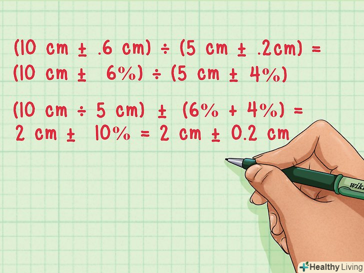 Поділ. щоб розділити величини з похибками, розділіть величини і складіть відносні похибки.[9]- (10 см ± 0,6 см) ÷ (5 см ± 0,2 см) = (10 см ± 6%) ÷ (5 см ± 4%)