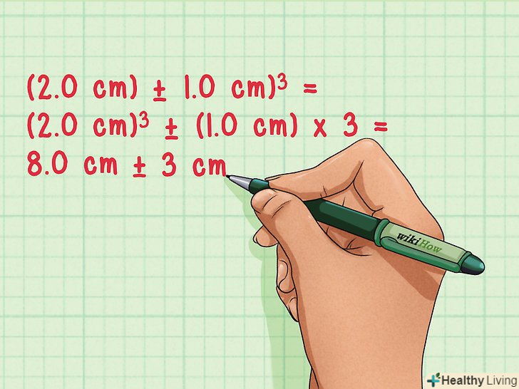 Зведення в ступінь. для того, щоб звести в ступінь величину з похибкою, зведіть величину в ступінь, а відносну похибку помножте на ступінь.[10]- (2,0 см ± 1,0 см)3 =