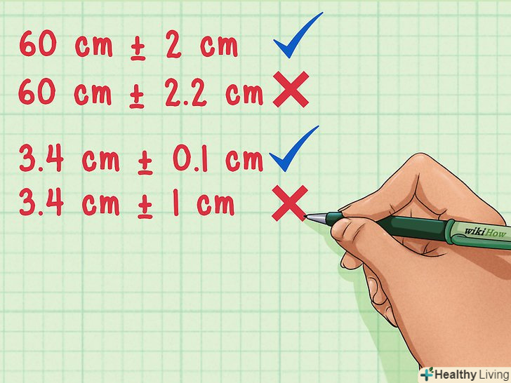 Завжди округлюйте значення вимірювань до того ж знака після коми, що і в похибки.результати вимірювань, які враховують похибку, як правило, округлюються до однієї або двох значущих цифр. Найбільш важливим моментом є те, що потрібно округлити результати до того ж знака після коми, що і в похибки, щоб зберегти відповідність.- Якщо результат вимірювання 60 см, то і похибка слід округляти до цілого числа. Наприклад, похибка цього вимірювання може бути 60 см ± 2 см, але не 60 см ± 2,2 см.