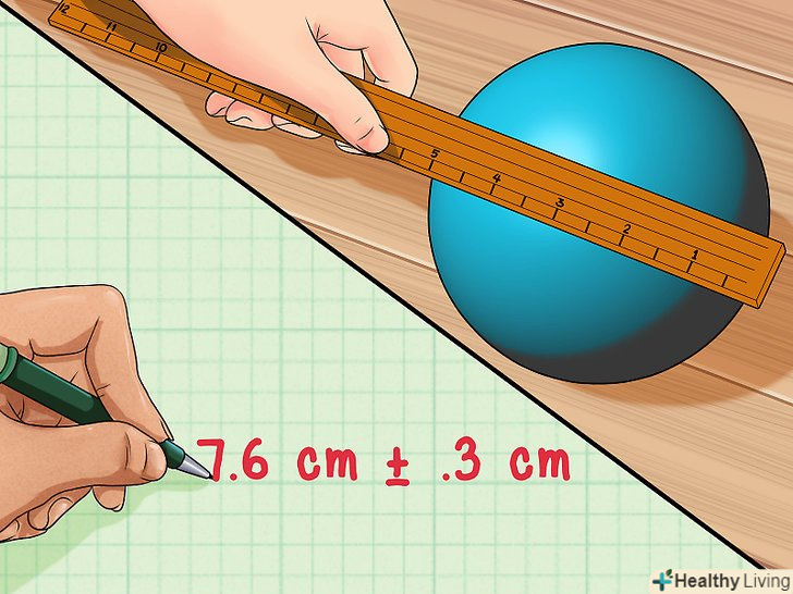 Знайдіть похибку.Припустимо, ви вимірюєте лінійкою діаметр круглого кулі. Це складно, так як через кривизни кулі буде важко поміряти відстань між двома протилежними точками на його поверхні. Скажімо, лінійка може дати результат з точністю до 0,1 см, але це не означає, що ви можете виміряти діаметр з тією ж точністю.[1]- Вивчіть кулю і лінійку, щоб отримати уявлення про те, з якою точністю ви можете виміряти діаметр. У стандартної лінійки чітко видно розмітку по 0,5 см, але, можливо, ви зможете виміряти діаметр з більшою точністю, ніж ця. Якщо ви думаєте, що зможете виміряти діаметр з точністю до 0,3 см, то похибка в цьому випадку дорівнює 0,3 см.