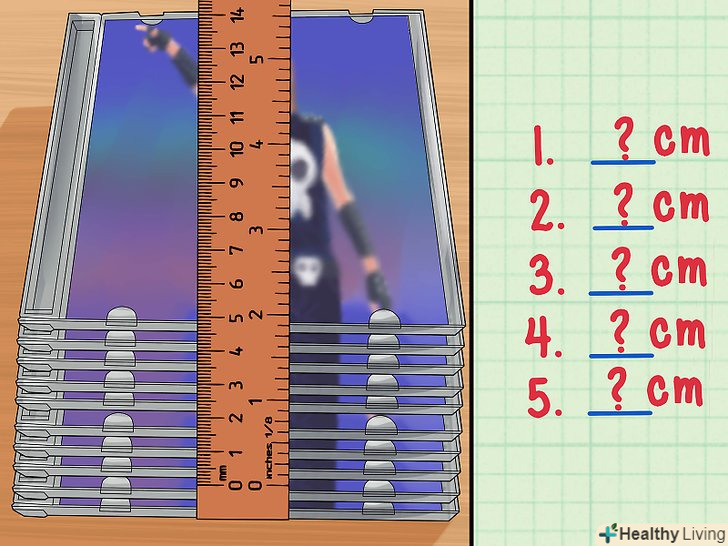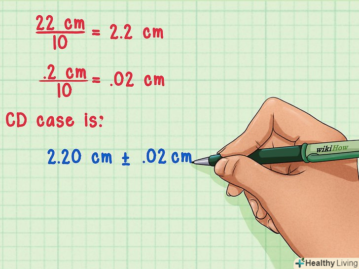Розрахуйте похибку вимірювання одного предмета з декількох.Скажімо, вам дано 10 компакт-дисків( CD), при цьому розміри кожного однакові. Припустимо, ви хочете знайти товщину всього одного CD. Ця величина настільки мала, що похибка практично неможливо обчислити. Проте, щоб обчислити товщину (і її похибка) одного CD, Ви можете просто розділити результат вимірювання (і його похибка) товщини всіх 10 CD, складених разом (один на іншого), на загальну кількість CD.[2]- Припустимо, що точність вимірювання стопки CD за допомогою лінійки 0,2 см. отже, ваша похибка ± 0,2 см.