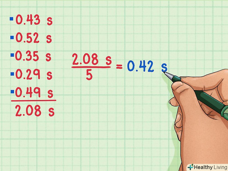 Знайдіть середнє арифметичне.тепер знайдіть середнє арифметичне шляхом підсумовування п'яти різних результатів вимірювань і розділивши результат на 5 (кількість вимірювань). 0,43 + 0,52 + 0,35 + 0,29 + 0,49 = 2,08 с. 2,08 / 5 = 0,42 с. середній час 0,42 с.