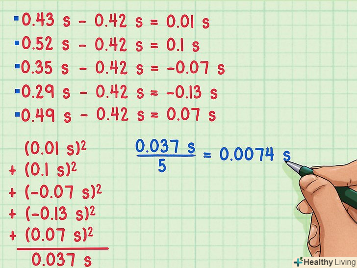 Знайдіть дисперсію отриманих значень .для цього, по-перше, знайдіть різницю між кожною з п'яти величин і середнім арифметичним. Щоб зробити це, відніміть з кожного результату 0,42 с.[4]- 0,43 с-0,42 с = 0,01 с