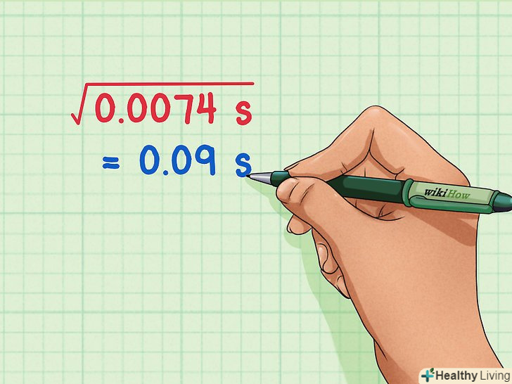 Знайдіть середньоквадратичне відхилення. щоб знайти середньоквадратичне відхилення, просто візьміть квадратний корінь з середнього арифметичного суми квадратів. Квадратний корінь з 0,0074 = 0,09 с, так що середньоквадратичне відхилення дорівнює 0,09 с.[5]