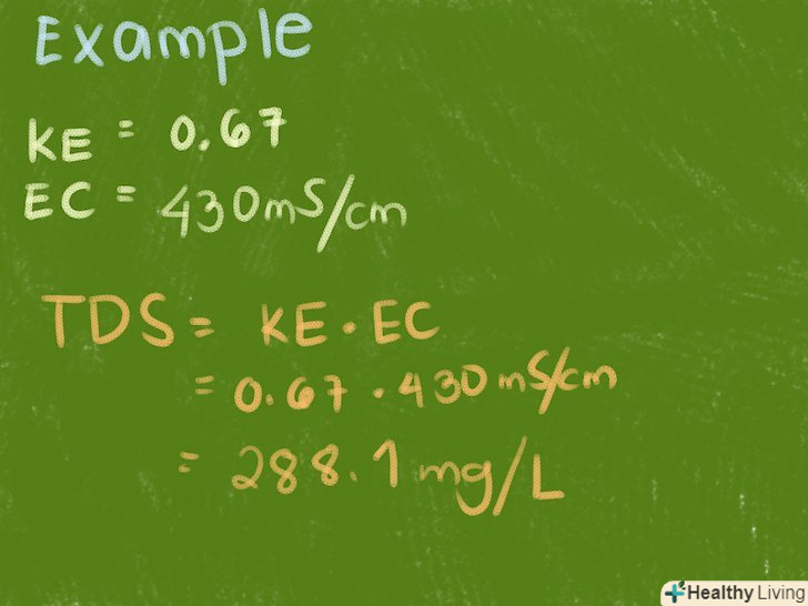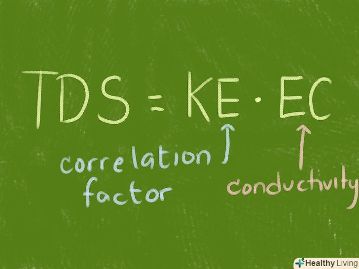 Підставте дані в формулу TDS.основна формула для розрахунку загального вмісту розчинених твердих речовин виглядає наступним чином. Математичні інструменти у формулі ЄС-це провідність вашого зразка та коефіцієнт кореляції. Коефіцієнт кореляції залежить від використовуваної рідини, а також може варіюватися в залежності від атмосферних умов. Ви можете знайти його для більшості рідин у стандартних таблицях з фізики.- У наведеному вище прикладі, скажімо, коефіцієнт кореляції при поточній температурі і в поточних умовах тиску 0,67. Використовуйте значення у формулі наступним чином. Математичні інструменти TDS для вашого зразка 288,1 мг / л.