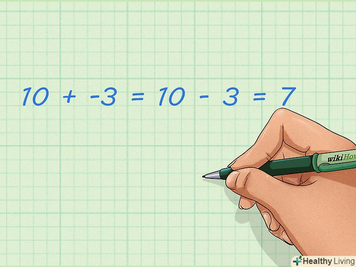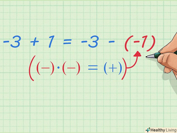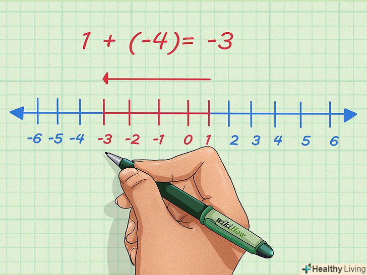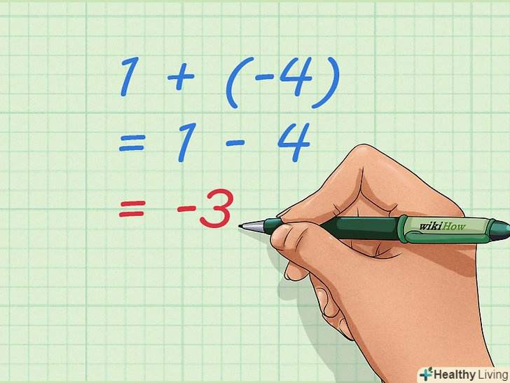 Якщо ви хочете скласти негативне число, замініть додавання на віднімання позитивного числа (а можна зробити і навпаки – замінити віднімання позитивного числа на додавання негативно числа).- Наприклад, розглянемо -4. Коли ви складаєте -4 і 1, ви зменшуєте 1 на 4. Так як зменшення є віднімання, то можна записати: