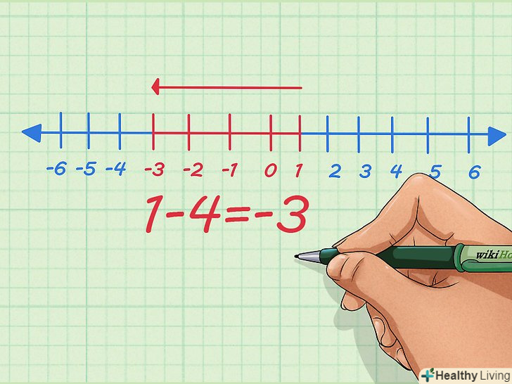 Позитивні числа при русі по числовій прямій вправо збільшуються, а негативні числа при русі по числовій прямій вліво зменшуються.складайте цілі негативні числа, рухаючись по числовій прямій вліво.- Наприклад, вирішіть 1 + (-4). Почніть з 1 і перемістіть палець на 4 мітки вліво. Під міткою, на якій ви зупинилися, буде цифра -3. Це і є результат додавання:
