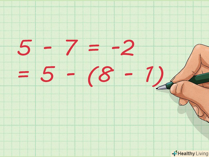 Замініть два мінуси на плюс. у нашому прикладі:5 - (8 - 1) = 5 - 7 = 5 - 8 + 1 .- Ви вже знаєте, що 5-8 = -3, тому замість 5 - 8 підставте -3:
