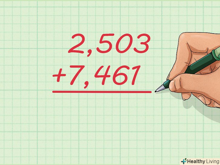 Наприклад, вирішіть 2503 + 7461. запишіть числа одне під іншим (тобто так, як ви записуєте їх для додавання в стовпчик). Зараз ми розповімо вам, як складати великі цілі числа, які ви не зможете скласти в розумі або на числовій прямій.- Зліва від записаних стовпчиком чисел поставте знак»+".