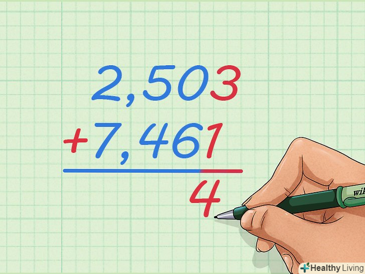 Почніть зі складання крайніх правих цифр (тобто цифр, що стоять в розряді одиниць).- У нашому прикладі крайніми правими цифрами є цифри 3 і 1; безпосередньо під ними напишіть їх суму: 4.
