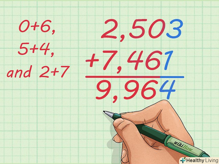 Переміщаючись справа наліво, складайте відповідні пари цифр.у нашому прикладі складіть 0 + 6, 5 + 4, 2 + 7. Під кожною парою цифр записуйте результати їх складання.- В кінцевому підсумку ви отримаєте відповідь: 9964. Перевірте цю відповідь.