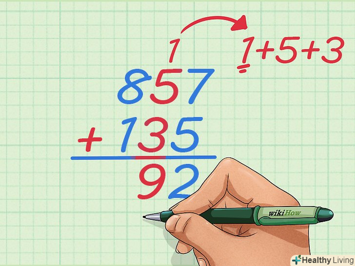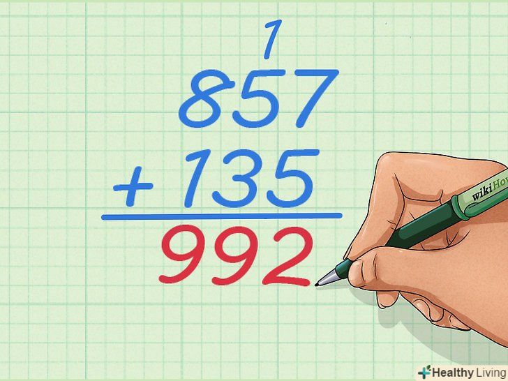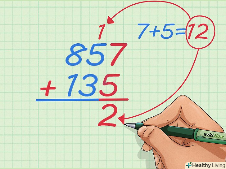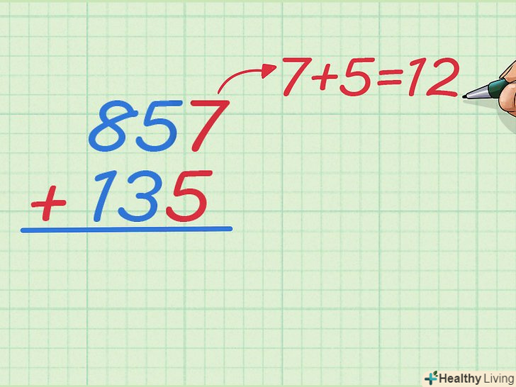 Тепер складіть 857 + 135. тут при додаванні першої пари цифр 7 + 5 Ви отримаєте 12; це двозначне число, яке не можна записати під складається парою цифр.